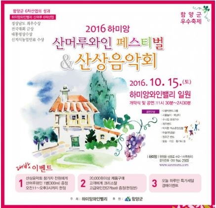 ㈜두레마을(대표 이상인)과 산머루작목반이 주최하는 제2회 하미앙 산머루와인페스티벌이 10월 15일 함양읍 삼봉로 ㈜두레마을 농원 일원에서 개최된다.