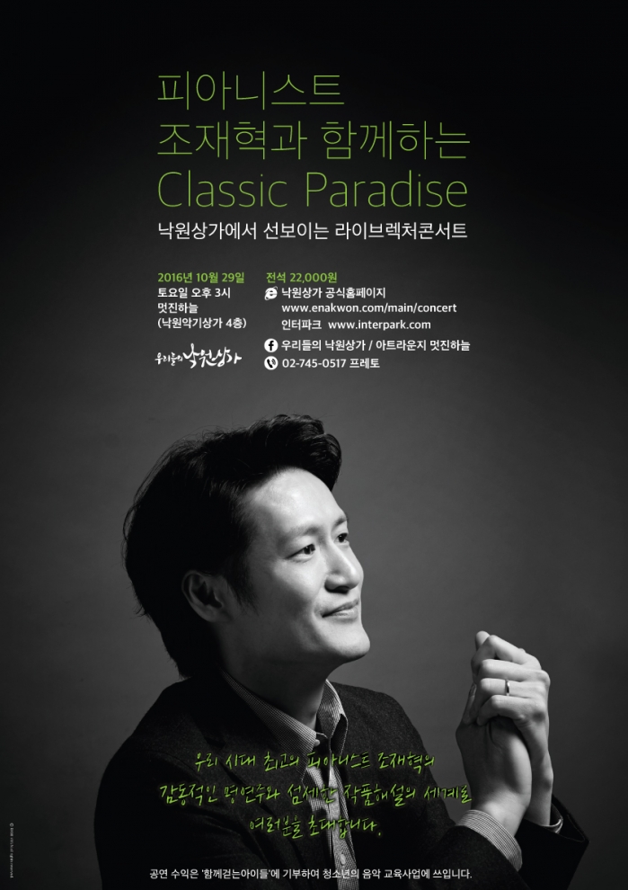 특히 "클래식 파라다이스"는 올해 낙원악기상가 4층 아트라운지 멋진하늘에서 열리는 마지막 공연으로 더욱 뜻 깊은 의미가 있다는 게 관계자의 설명이다. 올 한 해 동안 낙원악기상가에서는 어쿠스틱을 비롯하여 재즈, 그리고 영화 상영까지 다양한 문화 공연이 개최됐으나 클래식 공연은 이번이 처음이기 때문. 오후 3시부터 총 90분간 진행되는 공연은 피아니스트 조재혁의 해설과 함께 바흐부터 모차르트, 베토벤, 쇼팽 등 클래식 입문자들에게 친근한 곡들을 차례로 선보일 예정이다. 입장권은 2만 2천원으로 10월 17일부터 인터파크(goo.gl/brT5lW)와 낙원악기상가 공식 홈페이지(enakwon.com/main/concert)를 통해 예매가 가능하다.