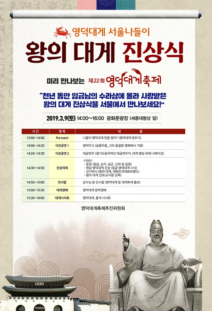 영덕군(군수 이희진)과 영덕대게추진위원회(위원장 이춘국)는 3월 9일(토) 14:00~16:00까지 서울 광화문 광장에서 영덕대게 서울 나들이 ‘왕의 대게 진상식’을 갖는다.