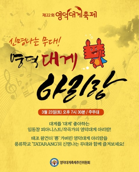‘대게 아리랑’은 풍류 아티스트로 알려진 피아니스트 겸 작곡가 임동창이 제작을 맡았으며, 3월 23일(토) 저녁 7시 30분 영덕대게축제장 주 무대에서 축하공연이 펼쳐진다.