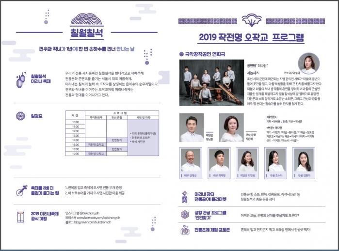 주요 프로그램은 국악연희극, 관상 궁합, 플리마켓, 전통혼례 포토존 및 즉석 사진관 등으로 칠월칠석을 테마로 한 다채로운 프로그램을 즐길 수 있다.