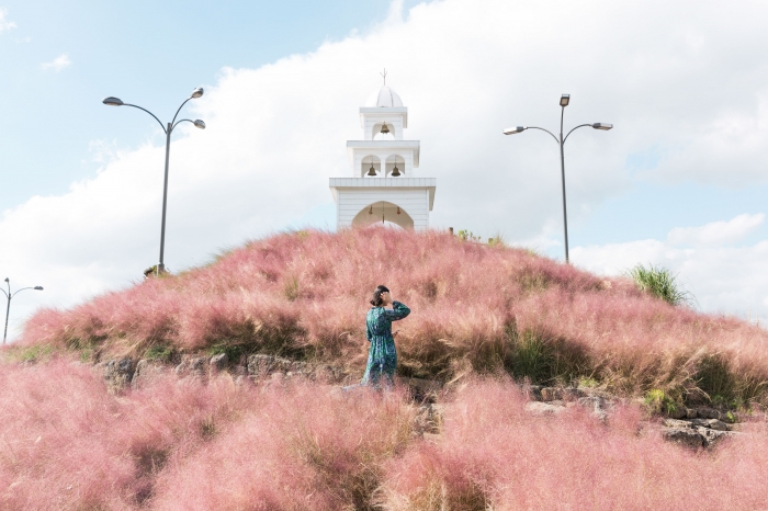 제주허브동산은 높이 10m, 둘레 300m 규모로 제주도 한라산을 연상하게 하는 분화구 모양의 핑크뮬리 오름을 조성했다. 평지에 펼쳐진 다른 핑크뮬리와는 다르게 오름을 따라 펼쳐진 핑크뮬리 군락에서 색다른 인생샷을 남길 수 있다. 오름 정상에는 종을 울릴 수 있는 하얀 종탑이 자리하고 있어 각자의 소망을 기원하며 종을 울릴 수 있으며 날씨가 맑은 경우 멀리 바다도 볼 수 있다.