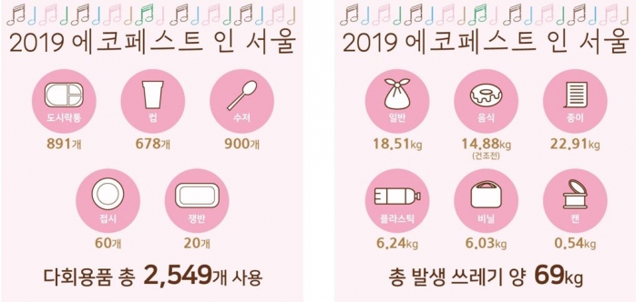 에코페스트 인 서울은 기존 페스티벌에서 꾸준히 문제되어 왔던 ‘과도한 일회용품 사용 문제’를 해결하고자 했다. 이에 컵과 다회용기(도시락통, 접시, 쟁반), 수저 대여 서비스를 제공했다. 행사 현장에서 총 △도시락통 891개 △컵 678개△수저 900개 △접시 60개 △쟁반 20개로, 총 2549개가 사용됐다. 일회용품 2549개의 사용을 막은 셈이다.