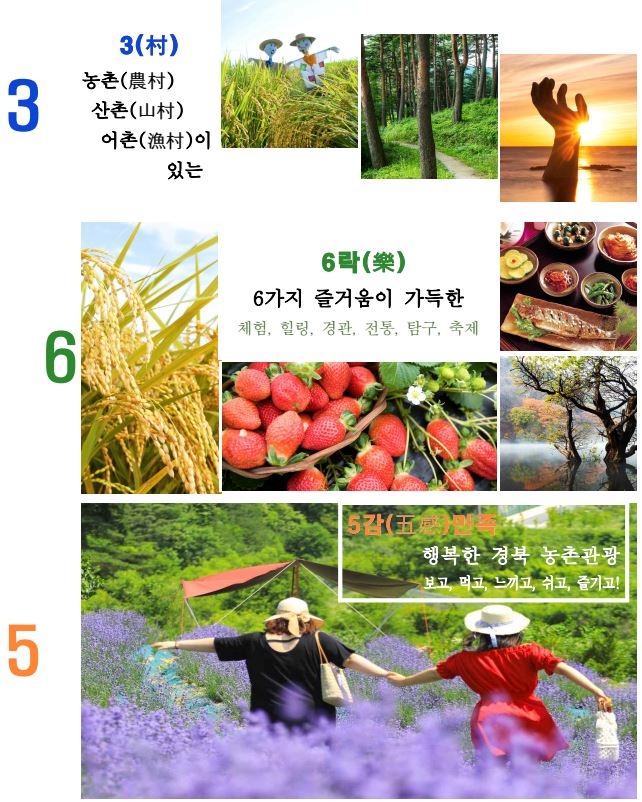 * 365 농촌관광 프로젝트 : 3村(농촌, 산촌, 어촌), 6樂(체험, 힐링, 경관, 전통, 탐구, 축제), 5感(보고, 먹고, 느끼고, 쉬고, 즐기고)