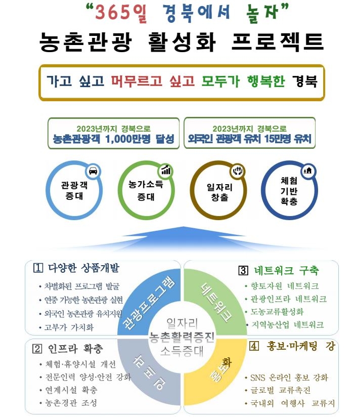 SNS 등 모바일을 통한 여행 정보의 증가, 개별 자유여행과 체험중심의 관광 트랜드 변화에 적극 대응하고 급변하는 농촌관광시장을 선점하기 위해 ‘365일 경북에서 놀자’라는 슬로건으로 농촌관광 중장기 플랜을 마련했다. 365 농촌관광 활성화 프로젝트는 2023년까지 농촌관광객 1,000만명, 외국인 관광객 15만명 유치를 목표로 한다. 이를 위해 ▲다양한 상품 개발 ▲인프라 확충 ▲네트워크 구축 ▲홍보‧마케팅을 강화하는 4대 전략을 마련하고 16개 세부 실천과제를 선정해 농촌관광을 활성화한다는 것이다. 도는‘2020년 대구-경북 관광의 해’를 맞이하는 올해에는 22개 사업에 100억원을 투입해 공격적인 농촌관광객 유치에 나설 계획이다.