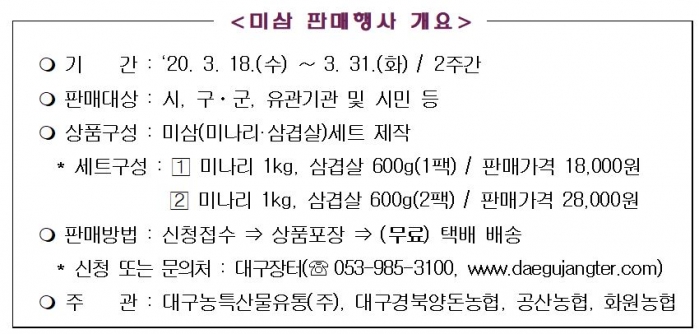 대구시는 코로나19 확산으로 산지 방문객 급감과 소비위축으로 실의에 빠진 미나리 재배 농가들을 돕기 위해 미나리와 삼겹살로 구성된 미삼세트를 시중대비 30%정도 저렴한 가격에 판매하도록 지원한다.