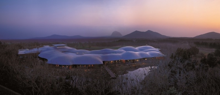 오름과 초가집을 모티브로 만들어져 “하늘에서 내려다보니 한 송이의 포도 같다”고 불리는 제주의 유명 포도호텔은 세계적인 건축가 이타미 준의 설계 철학이 그대로 녹아든 하나의 예술 작품인 호텔이다. 호텔 자체가 작품인 공간이며 제주 중산간 자락에 위치하여 자연 속 온전한 휴식을 제공한다.