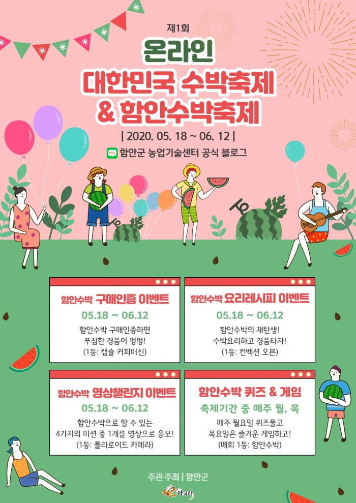 이번 ‘제1회 온라인 대한민국 수박축제·함안수박축제’는 함안수박 구매인증 이벤트, 함안수박 요리레시피 이벤트, 함안수박 영상챌린지 이벤트, 함안수박 퀴즈, 함안수박 게임 등 다채로운 프로그램으로 구성되어 있다. 5월 18일부터 6월 12일까지 총 26일간 함안군 농업기술센터 공식 블로그에서 진행 후 6월 19일 이벤트 당첨자 발표가 진행될 예정이다.