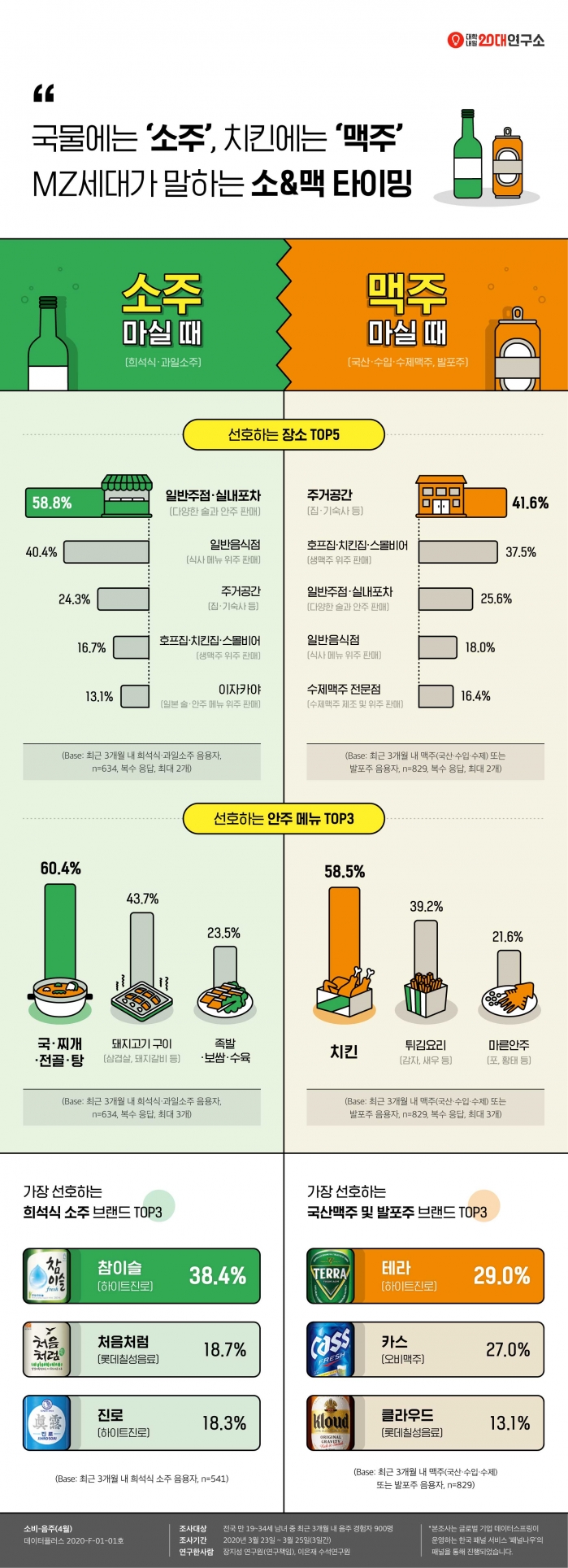 MZ세대가 소주와 맥주를 마실 때 선호하는 장소는 뚜렷한 차이를 보였다.