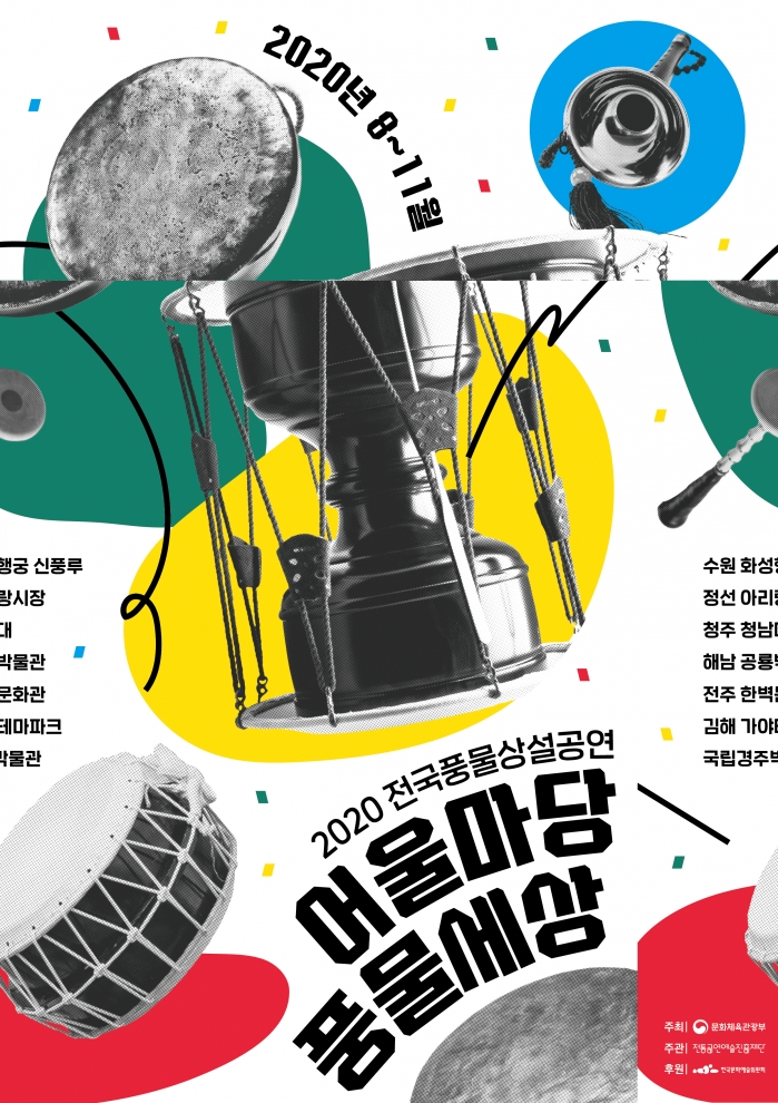 전통공연예술진흥재단(이사장 정성숙)은 2020 전국풍물상설공연 <어울마당 풍물세상>을 8월 15일(토) 국립경주박물관 공연을 시작으로 전국 7개 지역에서 순차적으로 개최한다.