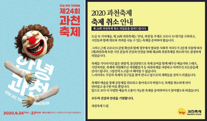 김종천 과천시장은 “시민과 관객의 건강과 안전을 확보하는 것이 최우선이라고 판단하여 축제를 취소하게 됐다. 과천축제를 기다려주신 많은 분의 아쉬움을 내년 축제에서 더욱 완성도 높은 공연들로 채워드릴 수 있도록 더욱 노력하겠다”고 말했다.