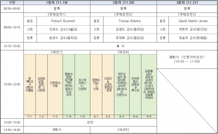 11월 19일 14시 30분에 진행되는 기조강연은 한국 인문학의 자존심이자 석학이자, 세계적인 인류학자인 서울대학교 김광억 명예교수의 강연이 진행되고, 3일간 진행되는 주제강연은 UCLA의 Robert Buswell 석좌교수, KCL의 Tobias Blanke 교수와 University of Glasgow의 David Martin-jones 교수가 강연자로 나서 온라인 실시간 중계 및 TBC 방송의 녹화중계로 열기를 이어간다.