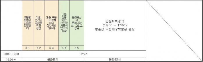 이와 더불어, 다양한 분야를 인문학적으로 고찰해 볼 수 있는 시간을 가질 수 있도록, 코로나19의 현 상황을 인문학적으로 살펴보는 ‘미래탐험연구소 이준정 대표’와 개최지 경주의 인문학적 가치를 나눌 수 있도록 ‘국립대구박물관 함순섭 관장’의 인문학특강이 함께 마련될 예정이다. 3일간의 인문학적 교류를 마무리할 11월 21일 폐회식에서는 인문학적 가치와 방향을 담아낸 ‘인문가치선언’을 현장 참가자, 랜선참가자와의 인터랙티브한 퍼포먼스와 함께 선언하며 대단원의 막을 내리게 된다.