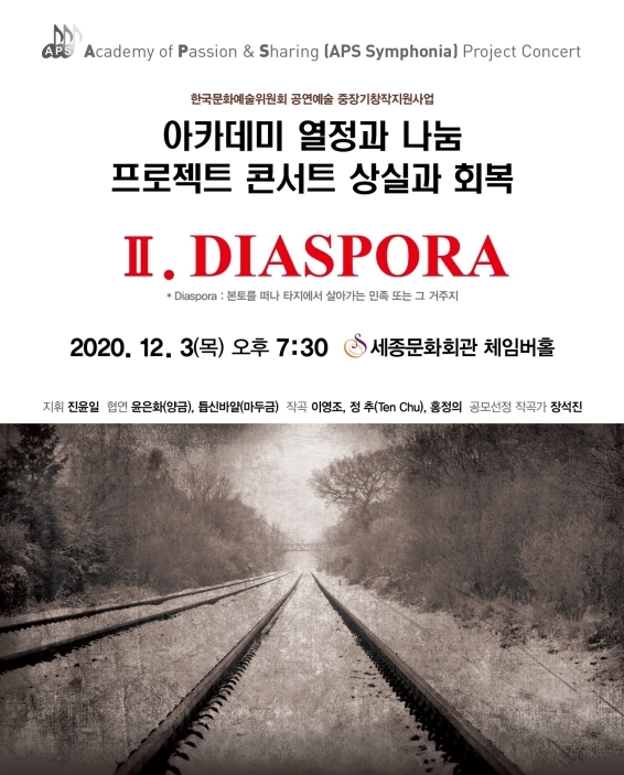 아카데미 열정과 나눔(APS)은 ‘상실과 회복’이라는 주제로 사별(死別)과 분단, 강제이주, 전체주의, 정치적 분열 등으로 인한 인간성 상실을 음악이 어떻게 극복하는지를 보여주고 그 과정을 음악이란 언어로 해석하고 관객과 공감하는데 목표를 두고 3년에 걸친 프로젝트를 진행 중이다. 총 4개의 음악회로 구성된 프로젝트 중 두 번째 공연 <상실과 회복 II. 디아스포라>가 음악감독 진윤일 지휘로 12월 3일 세종문화회관 체임버홀에서 개최된다.