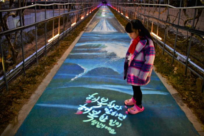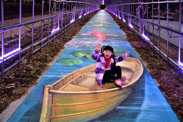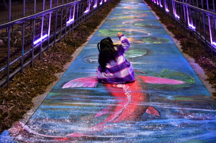 길이 120m, 폭 2m의 꽃 터널 바닥에 그려진 트릭아트 입체 포토존은 벽화 화가로 유명한 이은미 작가를 비롯해 6명의 작가가 지난해 12월, 10일간의 작업 끝에 완성했다.