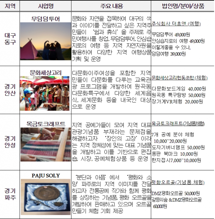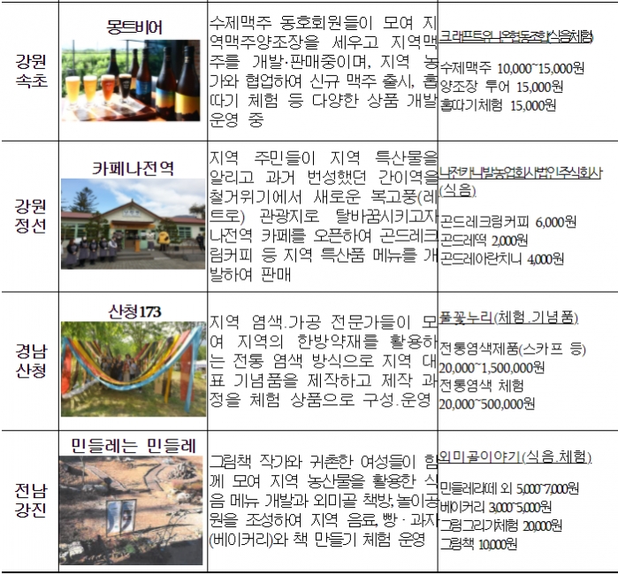 특히, 지난해 12월 8일, 공모를 통해 우수한 주민사업체 8곳을 으뜸 두레로 선정했다. 그 중 지역 내 수제 맥주 동호회에서 시작해 협동조합을 구성하고 사업화한 강원도 속초의 ‘몽트비어(크래프트유니온협동조합)’를 비롯한 으뜸 두레 3곳에 대해서는 문체부 장관상 등을 시상한다.