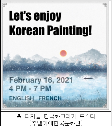 주벨기에한국문화원에서는 온 가족이 즐길 수 있는 한국 문화콘텐츠를 제공하는 ‘온라인 전래동화관’을 연다. 지난 1월, 홍길동전을 애니메이션으로 제작하고 상영한 데 이어, 설날을 계기로 제주도 기원의 전래동화인 <영등신화>를 단편 애니메이션으로 제작해 소개(2. 11.)한다. 또한 케이팝(K-POP) 신인 아이돌그룹 ‘블랙스완’과 함께 새해 인사말과 설날 의미를 소개하는 영상을 제작해 공개(2. 11.)한다. 특히 블랙스완에는 벨기에인 멤버 ‘파투’가 있어 현지 한류 팬들에게는 더욱 특별한 의미가 될 것으로 기대된다.