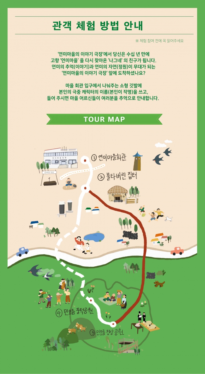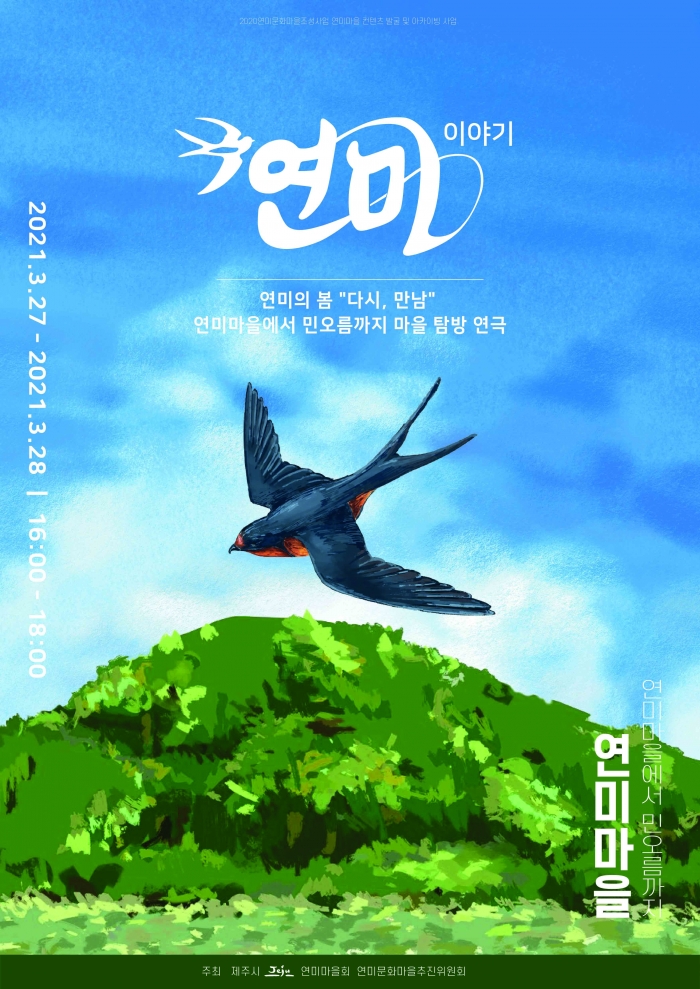 지난해 10월부터 연미마을 주민들의 추억 이야기를 아카이빙(기록)하고 그중에서 의미 있는 추억의 장소 4곳과 마을 길을 선정해, 4.3때 마을을 떠나 돌아오지 않은 인물이 수십 년 만에 어느 날 마을을 다시 찾는 하루의 여정에서, 관객 10여 명이 한 팀으로 주인공과 마을을 동행하는 서사로 이야기는 구성된다.