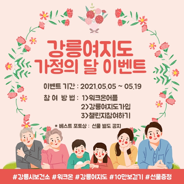 또한, 추가로 5월 5일부터 19일까지 ‘가정의 달 이벤트’도 진행한다. 이 이벤트에서는 연휴 또는 주말을 이용하여 가족 또는 친구와 함께 걸으며 추억을 쌓고, 강릉여지도 커뮤니티 게시판에 추억 사진을 게재하고 걸음 수 10만 보 달성을 인증할 시 추첨을 통해 200명에게 성공 기념품을 제공한다.