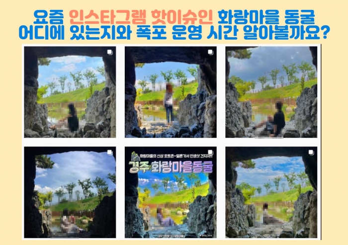 ‘화랑마을 동굴’은 한옥체험관(육부촌) 맞은편 수의지 폭포 내부에 있는 인공동굴이다. 올 초부터 입소문을 타기 시작해 최근 인스타그램 등 SNS를 중심으로 ‘화랑마을 동굴사진’이라는 제목으로 사진들이 속속 올라오고 있다.
