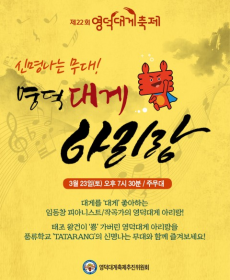 미리보기제22회영덕대게축제에서‘대게아리랑’이첫선을보인다. ‘대게아리랑’은풍류아티스트로알려진피아니스트겸작곡가임동창이제작을맡았으며,3월23일(토)저녁7시30분영덕대게축제장주무...