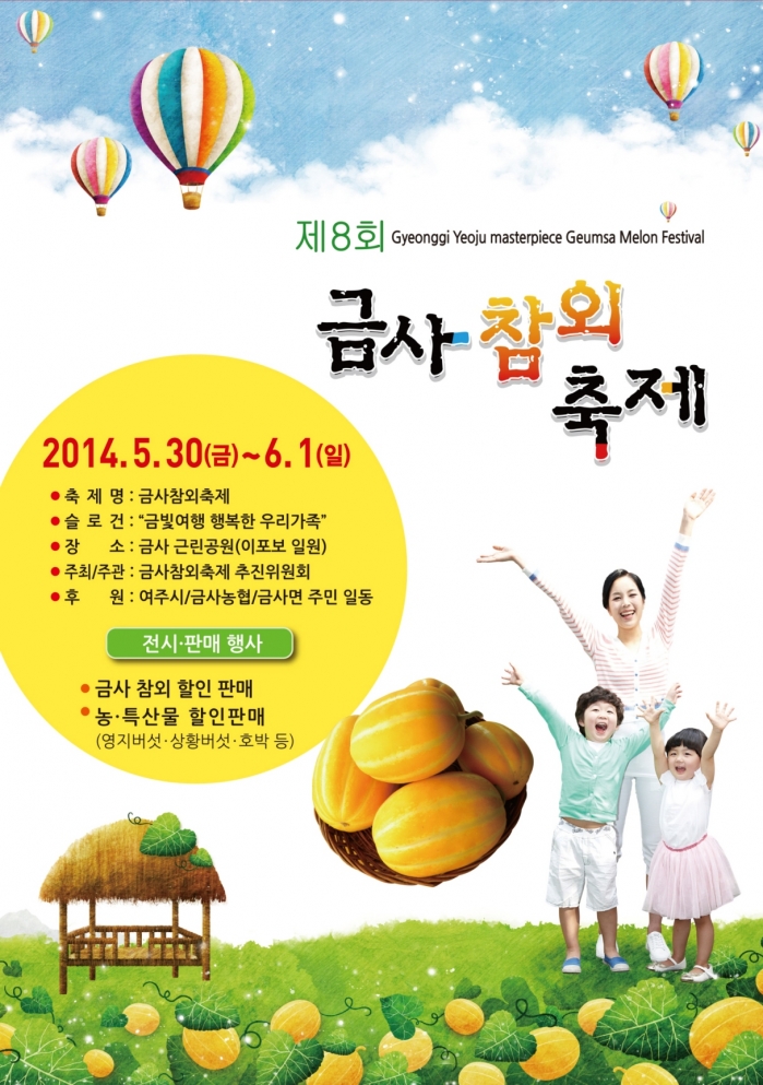 오는 5월 30일부터 6월 1일까지 3일간 명품참외의 고장 여주시 금사면(이포리 금사근린공원내 천연잔디구장)에서 열리는 이 축제는 금사참외축제추진위원회가 주최하고 여주시, 금사농협, 금사면민이 후원하며 개막식은 오는 5월 30일 오후 4시부터 진행된다.