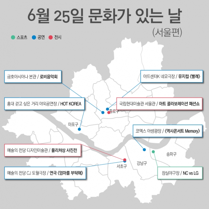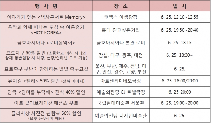 우선, 호국・보훈의 달이자 64주기 6·25를 맞아 국립국악원에서는 나라를 위해 희생된 영혼을 위로하고 안식을 비는 국악공연 ‘꽃으로 피어나소서’를 무대에 올린다. 또한 이날 12시 10분, 코엑스 아셈광장에서는 일제강점기와 6·25 등, 대한민국의 아픈 지난 이야기와 음악이 함께하는 공연 ‘역사콘서트 메모리(Memory)’가 개최될 예정이다.