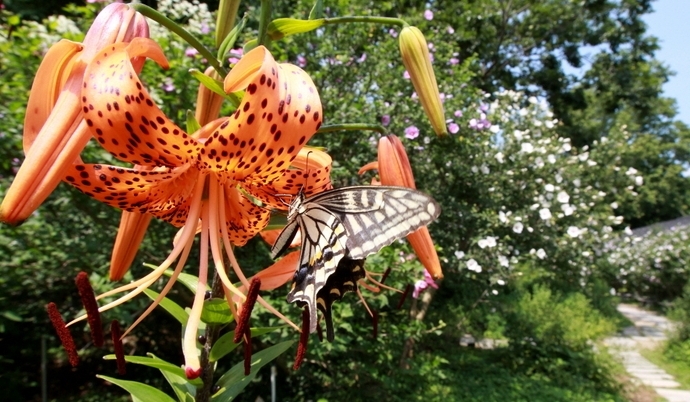 포항시 북구 청하면 기청산식물원에 활짝 핀 야생화 말나리에 나비 한 마리가 날아들고 있다.
