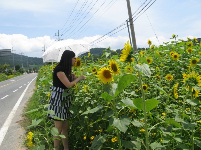 강진청자축제가 열린다. 축제장 길목에 왜성(키작은)해바리기가 수줍은 아낙내의 모습으로 활짝 펴 축제분위기를 한층 돋우고 있다. 지난 4월 함께 파종한 금계국과 어우러져 강진청자축제장을 찾는 관광객을 반기며 해바라기는 수줍게 웃고 있다.