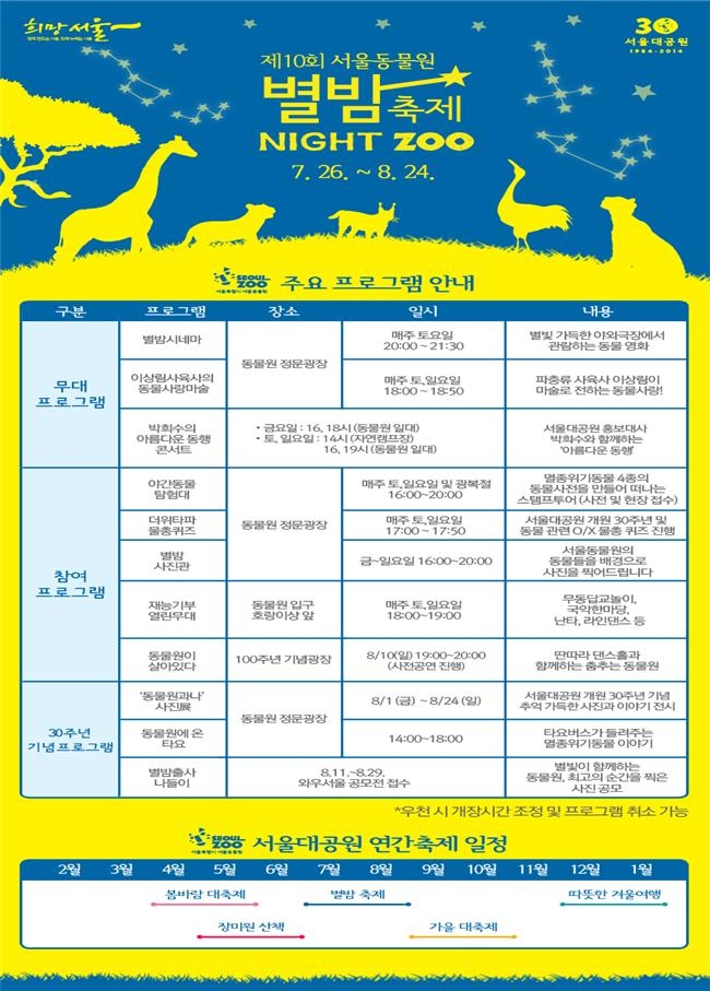 「별빛 가득한 야생 숲 속으로」의 주제로 진행되는 서울동물원 별밤축제는 올 해로 10회째를 맞는 서울대공원의 대표 축제이다. 7월 26일(토)부터 8월 24일(일)까지 30일 간 서울동물원 일대에서 진행된다.