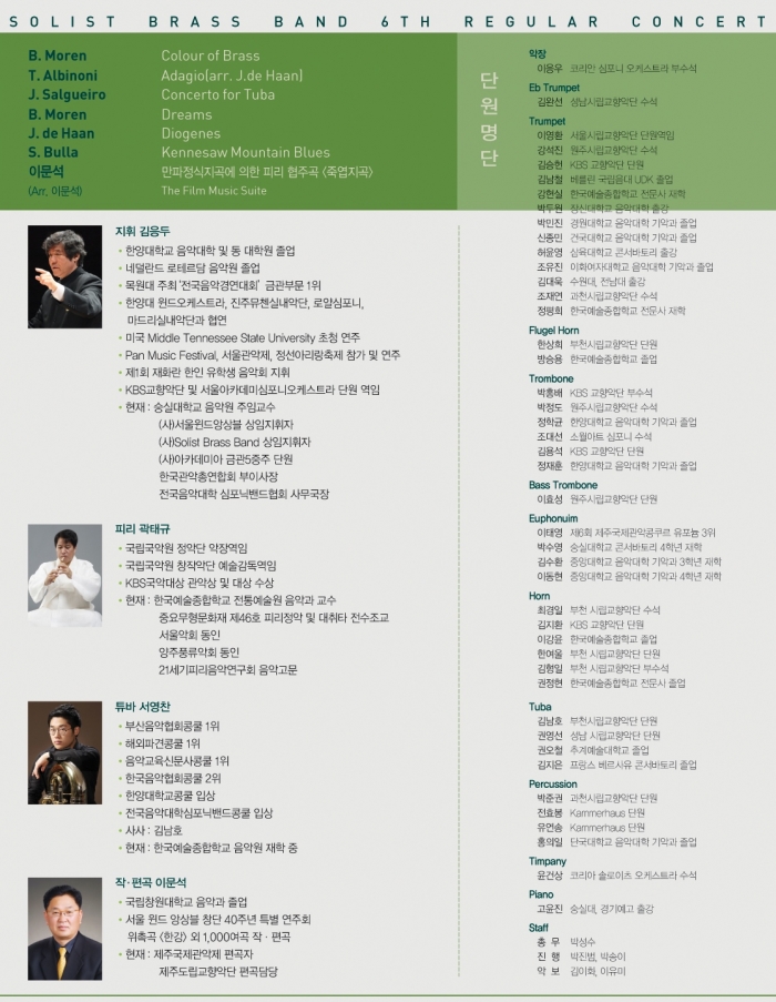 우리나라 최고 수준의 금관악기 연주자들로 구성된 솔리스트 브라스밴드가 올해로 여섯번째로 연주하는 이 공연은 상임지휘자 김응두 교수의 지휘아래 웅장하면서도 감미로운 선율을 선사할 예정이다.