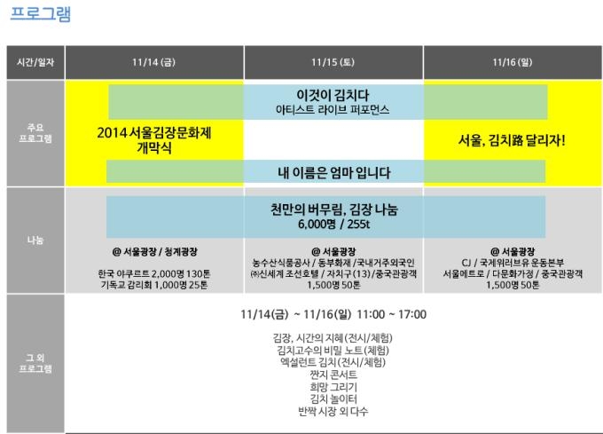 서울시는 유네스코 인류무형유산에 등재된 김장문화를 재현하고 재창조해 세계인이 함께 즐기는 대동축제로 육성하기 위한「2014 서울김장문화제」를 첫 개최한다.