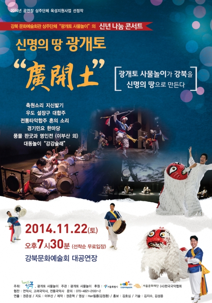 강북구(구청장 박겸수)강북문화예술회관에서는 오는 11월 22일, 저녁 7시 30분 강북구민들을 위한 광개토 사물놀이 예술단(단장:권준성)의 “신명의 땅 광개토-廣開土” 공연을 개최한다고 밝혔다.