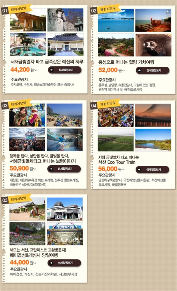 서해금빛열차를 타고 주변 관광지를 함께 여행하는 패키지 당일 여행 상품은 ▲금쪽같은 예산의 하루 ▲홍성으로 떠나는 힐링 기차여행 ▲보령이야기 ▲서천 Eco Tour Train ▲해뜨는 서산, 프란치스코 교황방문지! 해미읍성 & 개심사 당일여행 코스 등이 있다.