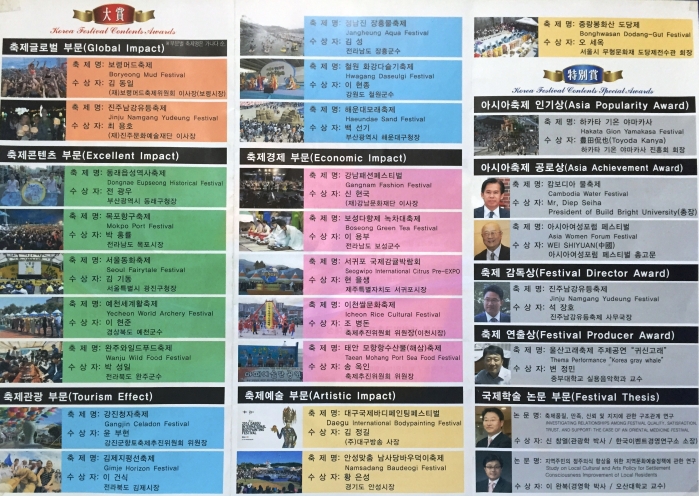 시민단체 대표와 축제 관련 전문가들로 구성된 심사위원단의 엄정한 평가를 통해 부문별 총 20개 축제가 선정되었으며, 시상식은 (사)한국축제콘텐츠협회 차정현 회장과, 심의위원장인 (사)한국지역산업문화협회 박선우 이사장을 비롯해, 수상단체장으로 시장 군수 구청장 및 축제관계자 들이 대거 참석하였다.