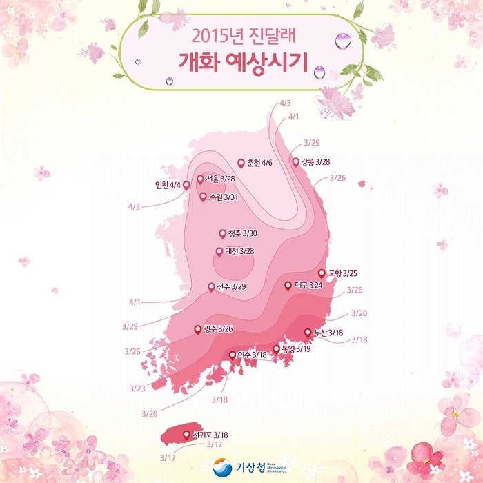 ■ 진달래 : 서귀포에서 3월 18일, 서울에서 3월 28일 개화