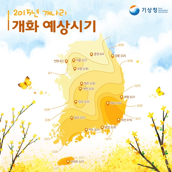 ■ 개나리 : 서귀포에서 3월 15일, 서울에서 3월 27일 개화