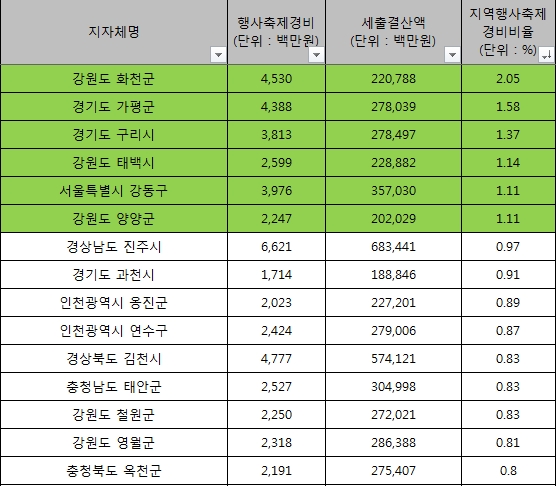 각 지자체의 결산 대비 행사축제 경비비율이 가장 높은 지자체는 1위 강원도 화천군, 2위 경기도 가평군, 3위 경기도 구리시, 4위 강원도 태백시, 공동 5위 서울특별시 강동구, 강원도 양양군이라고 발표했다. 이 곳들은 모두 전체 결산의 1% 이상을 지역축제에 쓰고 있다고 한다.