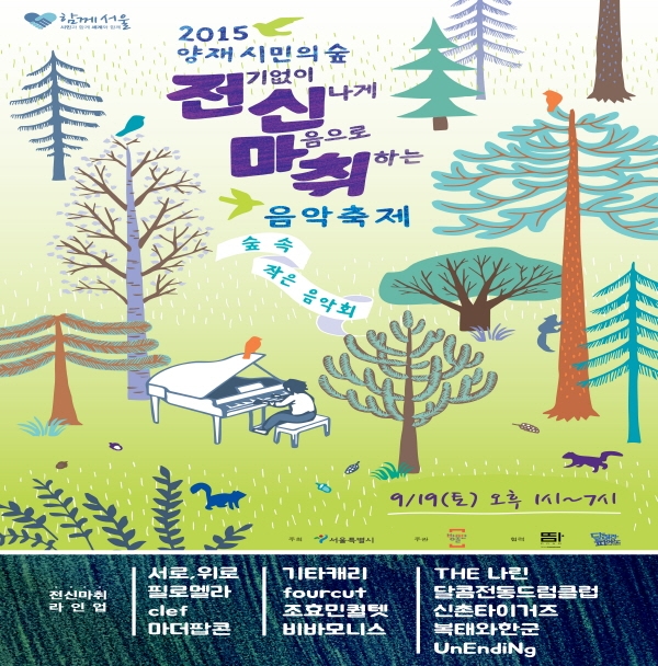 양재동 시민의숲에서 자연친화적인 전신마취음악축제가 9월 19일(토) 13시부터 19시까지 열린다.