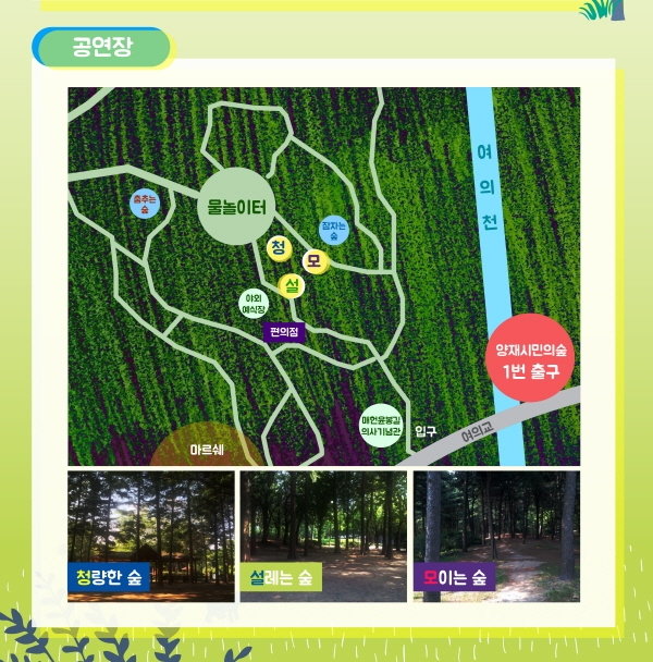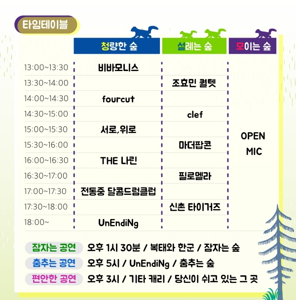 공연은 ‘청량한 숲, 설레는 숲, 모이는 숲, 춤추는 숲’이라는 컨셉으로 자연과 어울리게 꾸며진 4개의 공간에서 펼쳐지는데, 관객에게 공연팀이 직접 찾아가는 깜짝 이동 공연도 준비되어 있다.