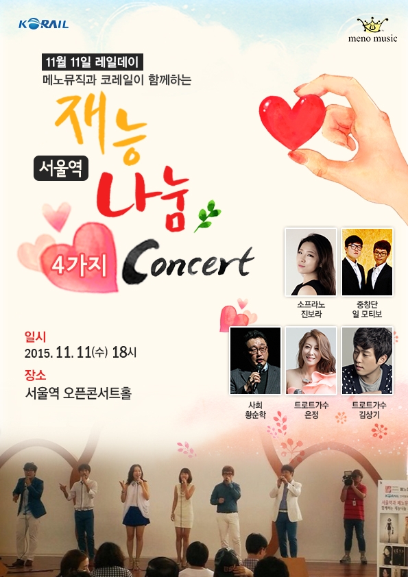 서울역 KORAIL 주최, 메노뮤직 주관으로 매월 마지막 주 금요일에 진행되던 재능나눔콘서트가 11월에는 특별히 기차 레일을 닮은 숫자 ‘11’에서 착안해 코레일이 지정한 레일데이인 11일 펼쳐진다.