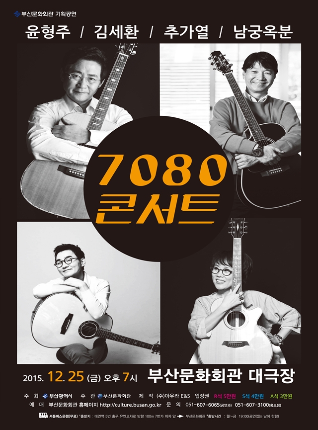 부산시 문화회관(관장 이승호)은 12월 25일 저녁 7시 문화회관 대극장에서 7080을 대표하는 가수들을 초청한 기획공연으로 ‘7080 콘서트’를 개최한다.