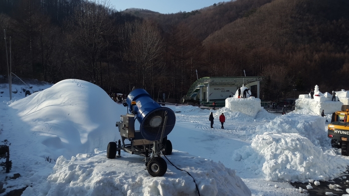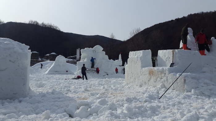 올해 얼음낚시를 위주로 하는 많은 겨울축제가 이상 고온 현상으로 취소된 가운데 눈축제 준비장에 많은 관광객이 몰리고 있다.