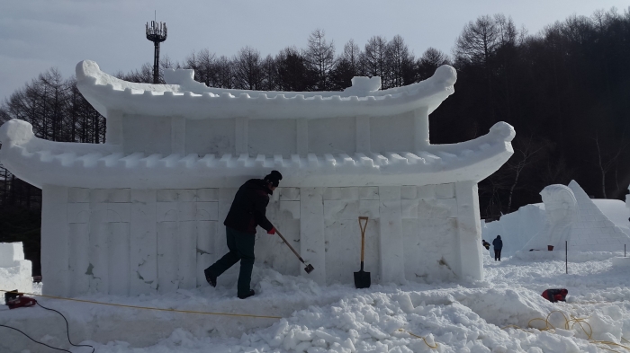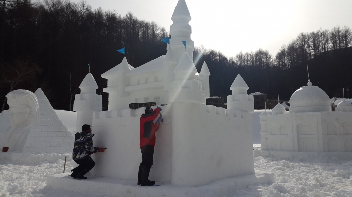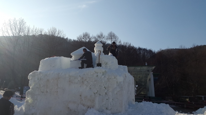 제23회 태백산 눈축제의 메인 프로그램인 눈조각 전시를 위해 눈조각 작품의 제작 작업이 한창이다.