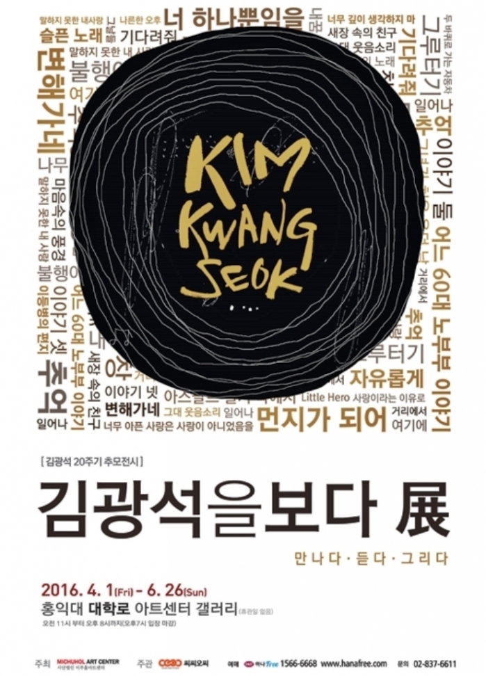 잊을 수 없는 청춘가수 故김광석(1964-1996)의 20주기를 추모하는 ‘김광석을보다展; 만나다·듣다·그리다’ 전시회가 4월 1일(금)부터 6월 26일(일)까지 서울 종로구 대학로의 홍익대 대학로 아트센터에서 열린다.