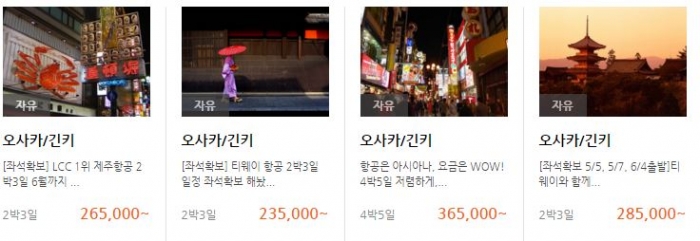 5월 연휴 기간인 5일부터 7일까지 단 3일간 출발하는 이번 상품은 인천과 오사카를 오가는 왕복 항공권, 유류할증료 및 텍스, 호텔이 포함된 에어텔 상품이다. 2박 3일, 3박 4일 두 가지로 준비되어 있어 일정에 따라 선택할 수 있다.