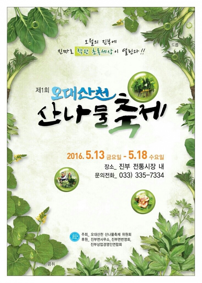 5월 13일부터 18일까지 6일간 열리는 이 축제는 진부면사무소, 진부면번영회, 진부상업경영인연합회가 후원하고 오대산천 산나물축제위원회(위원장 권용택)가 주최한다. 이 곳에 가면 곰취, 곤드레, 누리대, 키다리 나물과 산마늘 등 각종 산나물들을 맛볼 수 있다.