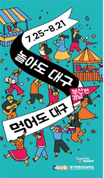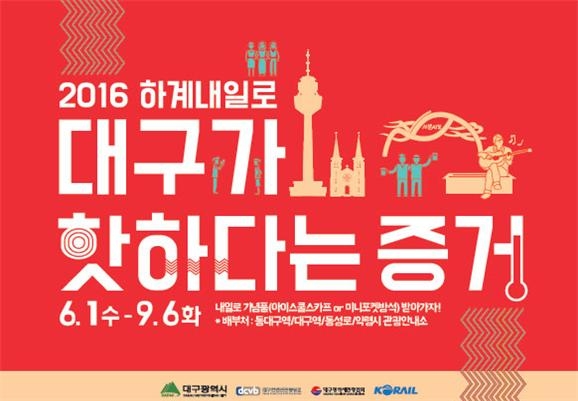 대구시는 대구컨벤션관광뷰로, 대구관광협회 등 유관기관과 문화관광해설사, 대학생블로그기자단 등 40여 명과 함께 부산역과 광복동에서 2016 대구여름축제의 메인테마인 치맥페스티벌(7. 27. ~ 7. 31.)과 7월 25일부터 진행하는 부산․경남시민 대상 대구방문주간 이벤트(7. 25. ~ 8. 21.), 서문시장(야시장)․사문진나루터․앞산전망대․팔공산 등 여름관광지를 홍보하기 위해 리플릿과 기념품을 배포하는 열띤 홍보마케팅을 펼치고 있다.