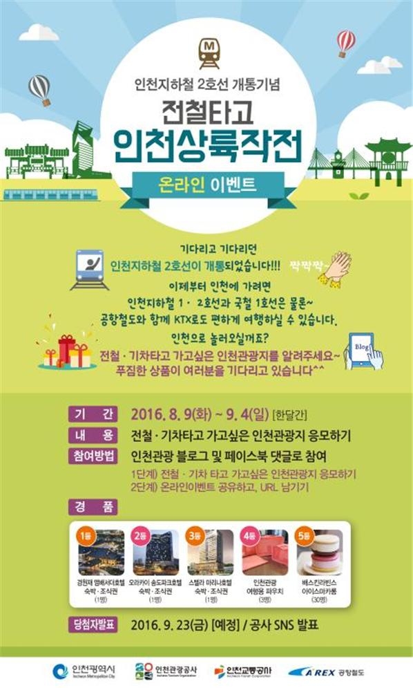 인천지하철 2호선 개통기념 <전철타고 인천여행상륙작전> 온라인 이벤트는 8월 9일부터 9월 4일까지 한달 간 인천지하철 및 공항철도, KTX 등을 타고 가고 싶은 인천관광지를 응모하는 행사로, 추첨을 통해 당첨자에게는 1등(1명) 경원재 앰버서더호텔 숙박권, 2등(1명) 오라카이 송도파크호텔 숙박권, 3등(1명) 스텔라마리나호텔 숙박권, 4등(3명) 인천관광 여행용파우치, 5등(30명) 아이스크림 기프티콘 등의 푸짐한 경품을 증정한다. 자세한 내용은 인천관광 블로그(https://yourincheon.tistory.com/1707) 및 페이스북(https://www.facebook.com/yourincheon)을 통해 참여할 수 있다.
