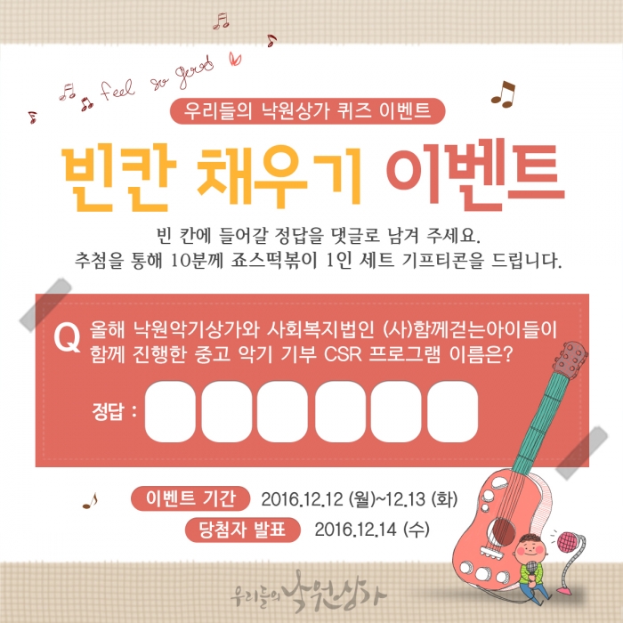17일 공연을 기념해 우리들의 낙원상가 공식 페이스북(https://www.facebook.com/nakwonmusic)과 블로그(https://blog.naver.com/enakwon)에서는 깜짝 이벤트를 진행한다. 간단하게 참여할 수 있는 "빈칸 채우기" 이벤트다. 이벤트 게시글에 좋아요를 누른 후, "2016 반려악기 캠페인"과 관련된 퀴즈의 정답을 작성하면 응모